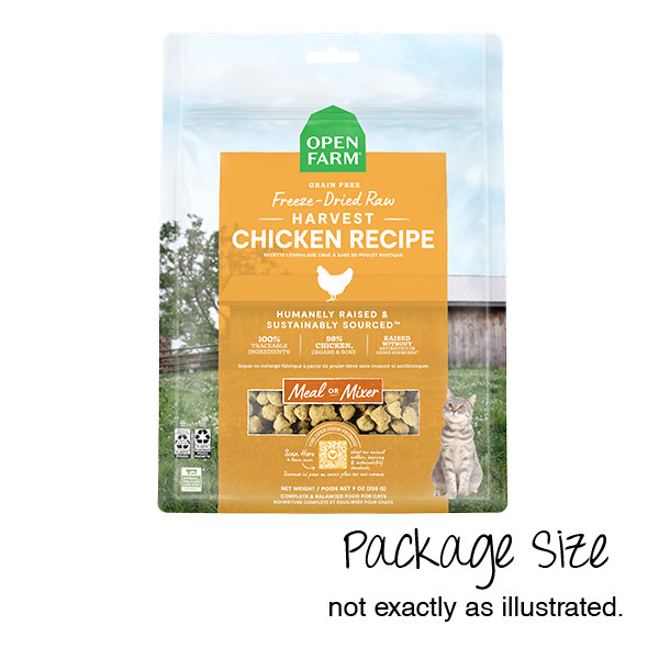 The most convenient way to feed your cat a real raw diet, this Open Farm Freeze-Dried Raw single animal protein recipe can be an irresistible meal-mixer to kickstart your cat's kibble or a delicious complete and balanced meal. Open Farm Harvest Chicken Recipe contains 98% humanely raised free-to-roam chicken, nutrient-rich chicken liver & chicken necks, and calcium-rich ground chicken bone, a true prey-model diet your cat won't be able to resist.