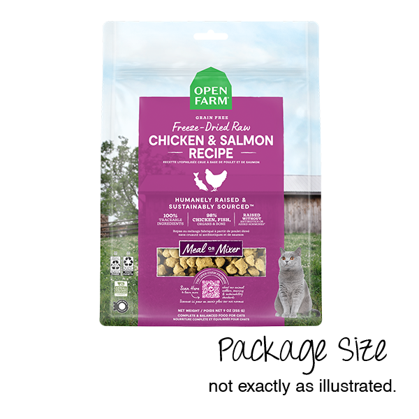 The most convenient way to feed your cat a real raw diet, this Open Farm Freeze-Dried Raw recipe can be an irresistible meal-mixer to kickstart your cat's kibble or a delicious complete and balanced meal! Open Farm Chicken & Salmon recipe contains a special blend of 98% humanely raised chicken, wild-caught salmon, and nutrient rich organ meat including chicken neck and chicken liver, a true prey-model diet your cat won't be able to resist.