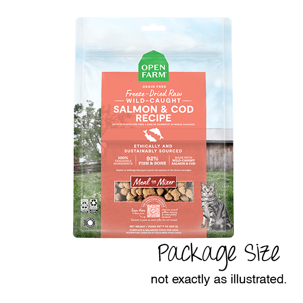 The most convenient way to feed your cat a real raw diet, this Open Farm Freeze-Dried Raw recipe can be an irresistible meal-mixer to kickstart your cat's kibble or a delicious complete and balanced meal! Open Farm Salmon and Cod recipe contains a special blend of 92% wild-caught salmon and pacific caught cod, a true prey-model diet your cat won't be able to resist.