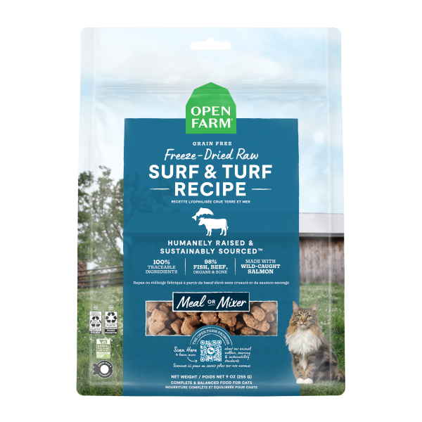 The most convenient way to feed your cat a real raw diet, this Open Farm Freeze-Dried Raw recipe can be an irresistible meal-mixer to kickstart your cat's kibble or a delicious complete and balanced meal! Open Farm Surf & Turf recipe contains a special blend of 98% grass-fed beef, wild-caught salmon, and nutrient rich organ meat including beef hearts, beef liver, and beef bones, a true prey-model diet your cat won't be able to resist.