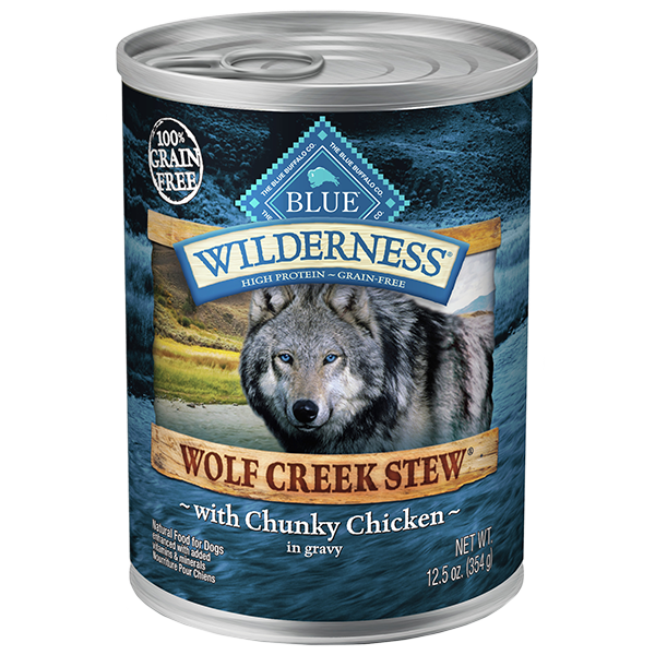 Inspired by Western-style campfire cooking, BLUE Wilderness Wolf Creek Stew is a hearty dinner that captures the spirit of the open prairies where wolves roamed freely. A hearty, grain-free recipe with generous chunks of chicken, Wolf Creek Chunky Chicken Stew is made with the meat your dog craves and is steeped in a savory gravy for an irresistible flavor. Fortified with vitamins and minerals, it contains only the finest ingredients with no chicken (or poultry) by-product meals, no corn, wheat, or soy. In addition, Wolf Creek is made without artificial preservatives, colors or flavors.
