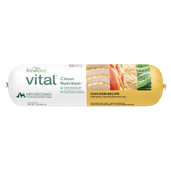 Freshpet Vital Balanced Nutrition Chicken with Vegetables & Rice is made with fresh chicken, vitamin-rich peas & carrots and high-fiber brown rice. Vital Balanced Nutrition recipes are prepared using fresh ingredients and wholesome grains, providing a multi-source fiber system to help maintain digestive health. This recipe is high in Omega-3 and 6 fatty acids, giving your dog the optimal nutrition he needs for healthy digestion and a shiny coat. Vital slice and serve rolls makes feeding easy.