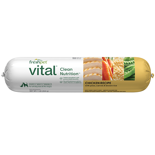 Freshpet Vital Balanced Nutrition Chicken with Vegetables & Rice is made with fresh chicken, vitamin-rich peas & carrots and high-fiber brown rice. Vital Balanced Nutrition recipes are prepared using fresh ingredients and wholesome grains, providing a multi-source fiber system to help maintain digestive health. This recipe is high in Omega-3 and 6 fatty acids, giving your dog the optimal nutrition he needs for healthy digestion and a shiny coat. Vital slice and serve rolls makes feeding easy.