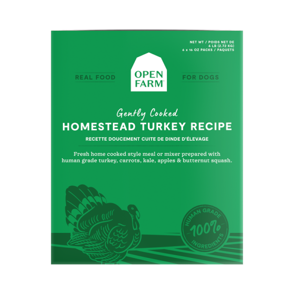 This hearty, slow-cooked recipe is packed with protein and nutrients, thanks to a mix of humanely raised turkey and non-GMO veggies and superfoods - all 100% human-grade ingredients. Open Farm Gently Cooked recipes are frozen, pre-portioned pouches of fresh food that are ready to defrost and serve. They contain 100% traceable ingredients from certified family farms and are antibiotic, hormone, and steroid-free. Open Farm uses a sous vide cooking process to remove bacteria while retaining more flavour and nutrients. Slow cooked dog food without the hassle of cooking!
