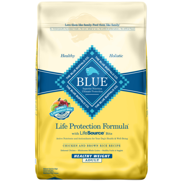 BLUE Life Protection Formula Healthy Weight Chicken and Brown Rice Recipe for Adult dogs is made with only the finest natural ingredients, without extra calories from fat to help dogs achieve and maintain a healthy weight. Made with delicious, protein-rich, deboned chicken and wholesome whole grains, garden veggies and fruit, BLUE Life Protection Formula contains NO chicken (or poultry) by-products, NO corn, wheat or soy and NO artificial colors, flavors or preservatives.