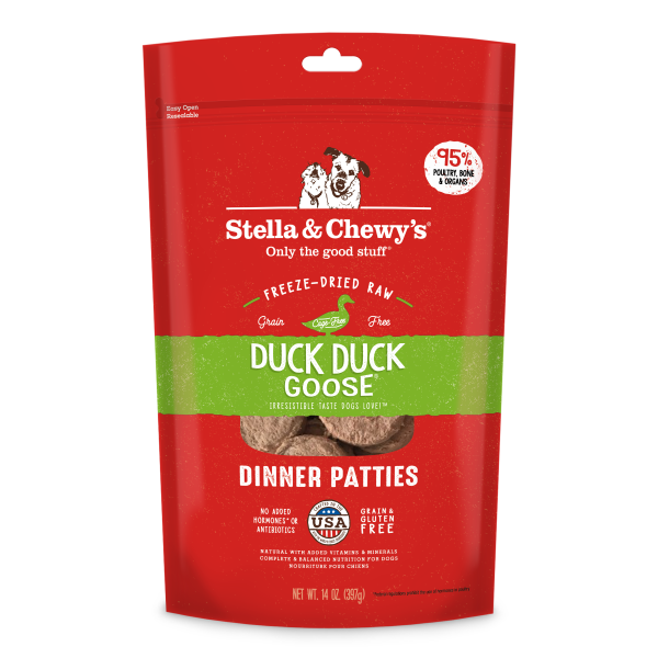 Stella & Chewy's Duck Duck Goose frozen raw, premade dinner patties are formulated to mirror a dog's ancestral diet. The most pure, pristine and economical raw nutrition available! Give your dogs what they naturally crave.
