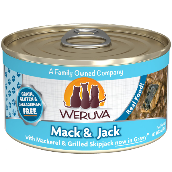 Weruva's Mack and Jack is a delicious, fishy combination your cat will love. Made with Mackerel and grilled Skipjack Tuna, Weruva contains no Grain, GMO, MSG or Carrageenan. The flaked meaty cuts of fish are hand placed into cans allowing you to see the grain free greatness of Weruva. Perfect for the discriminating palate of your favorite feline.