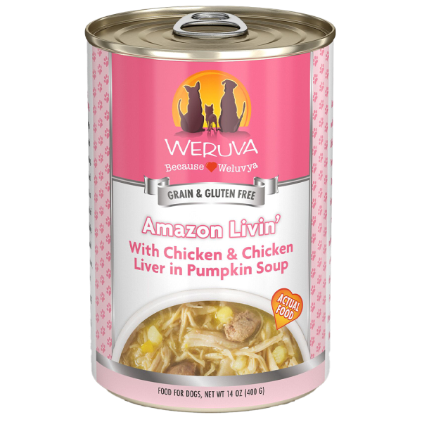 Your dog will enjoy every bite of this boneless, skinless, white breast meat chicken, with chunks of chicken liver and sweet potatoes in a delicious pumpkin gravy. Weruva Amazon Liver is enough to entice every palate! Did we mention that the chicken is free of added antibiotics and hormones, and it is also cage free?