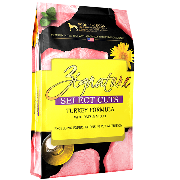 Zignature Select Cuts Tukey Formula for dogs is made with meat as the first ingredient, paired with ancient grains - making it high in fiber and protein. Turkey and turkey meal are the first two ingredients in this delicious formula. Then, it's bound with healthy wholesome ingredients like oats and millet. Turkey is a very rich source of protein, niacin, vitamin B6, and the amino acid tryptophan.