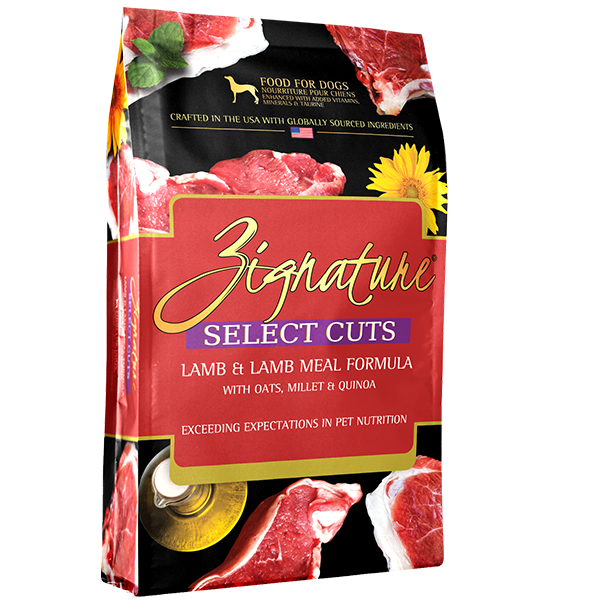 Zignature Select Cuts Lamb & Lamb Meal Formula for dogs is made with meat as the first ingredient, paired with ancient grains - making it high in fiber and protein. Lamb and lamb meal are the first two ingredients in this delicious formula. Then it's paired with wholesome ingredients like millet, oats, flaxseed and quinoa. Zignature Select Cuts Lamb & Lamb Meal Formula is a complete and tasty meal rich in lean protein, iron, zinc, and vitamin B12.