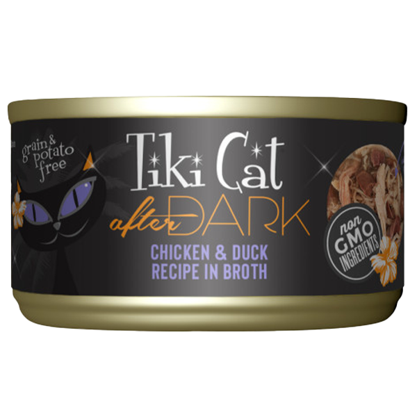 Who says nothing good happens after dark? Give cats the real meat they crave with tender shredded chicken, organ meat and duck in a luscious broth. Chicken liver, gizzards and heart add irresistible flavor and beneficial nutrients. Complete and balanced for all life stages, the high moisture content gives cats the supplemental water they need. Tiki Cat After Dark is high in protein with no grains or carbs, because cats are carnivores. Day or night, it's a feast for the feline carnivore.