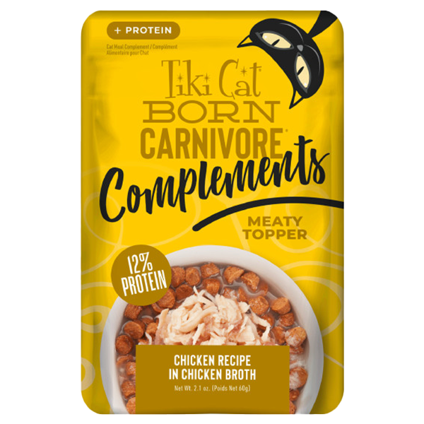 Cats need meat, not plants. Tiki Cat Born Carnivore Complements Chicken Meaty Topper is made using limited ingredients - high protein chicken and a hearty broth. It's high-protein nutrition that mimics the cat's prey diet and gives them precisely what they need as natural hunters.
